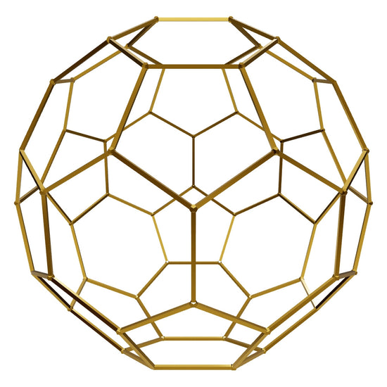 The truncated icosahedron — the shape of the soccer ball and the C60 fullerene molecule — unites pentagons and hexagons in perfect balance. Its 32 faces represent structured flow, the organization of emotional and creative energy. Nature chose this form to build the molecules of life.